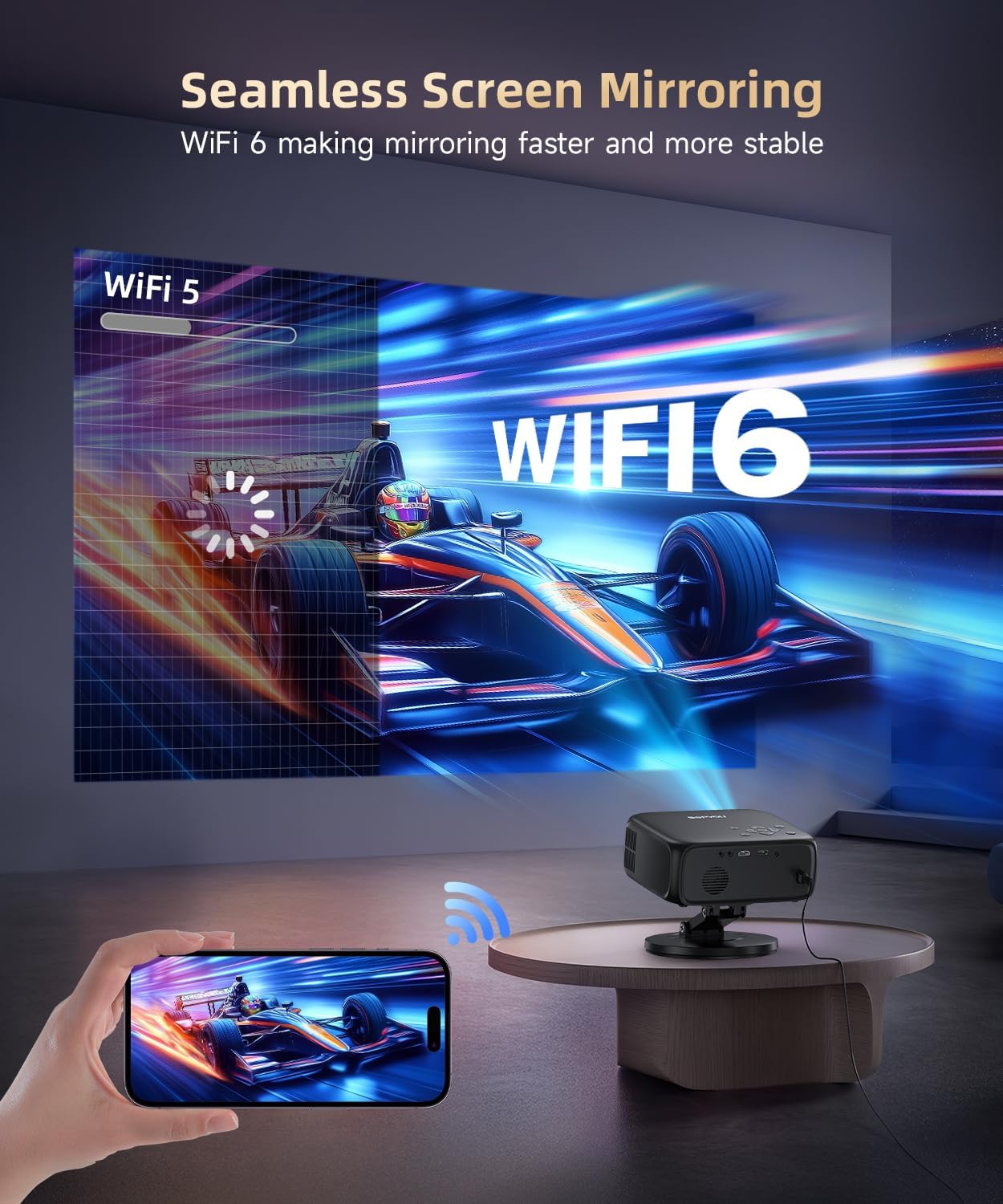 - Effortless Connectivity: The projector with WiFi and bluetooth boasts 6G WiFi and Bluetooth 5.2, it ensures swift and stable wireless links. With HDMI, USB & 3.5mm ports, easily connect to your phones, laptops, PS5, Switch etc., catering to diverse entertainment scenarios.